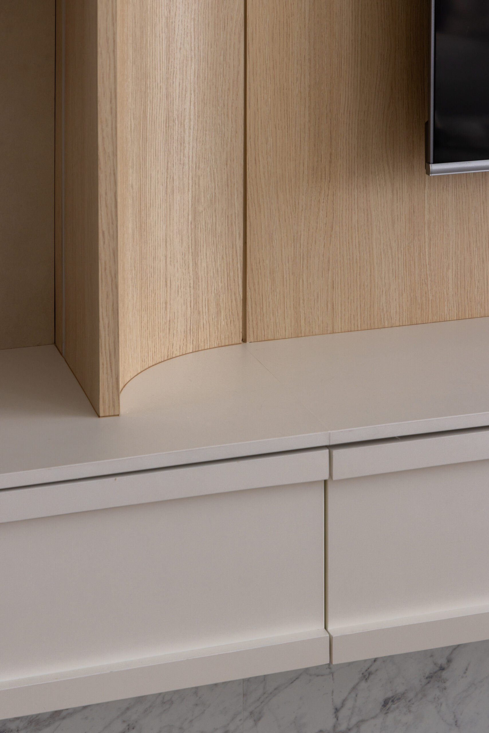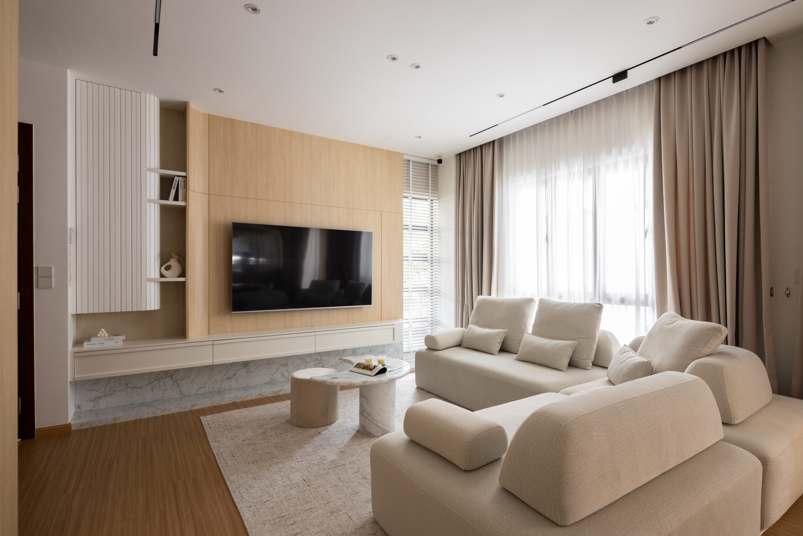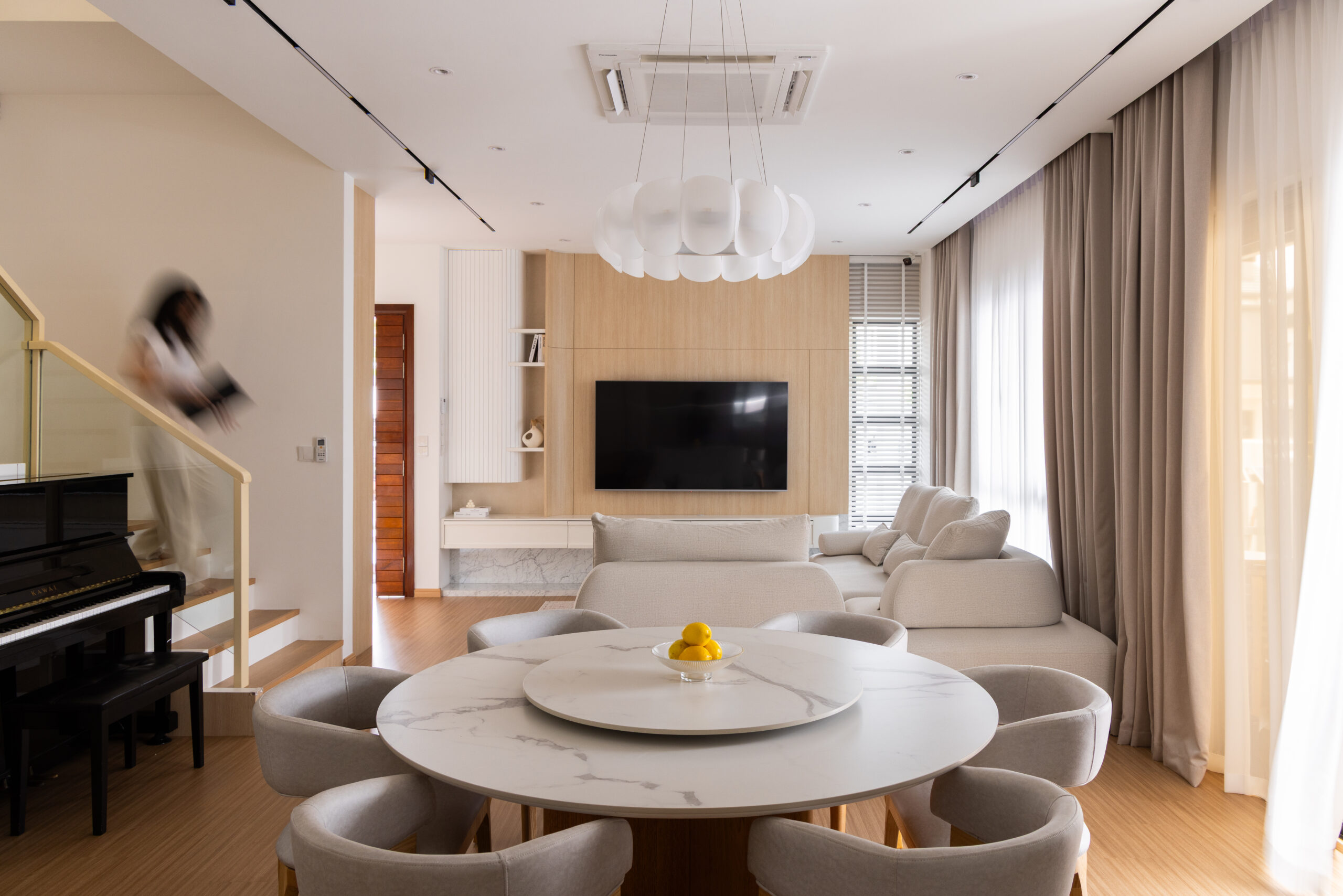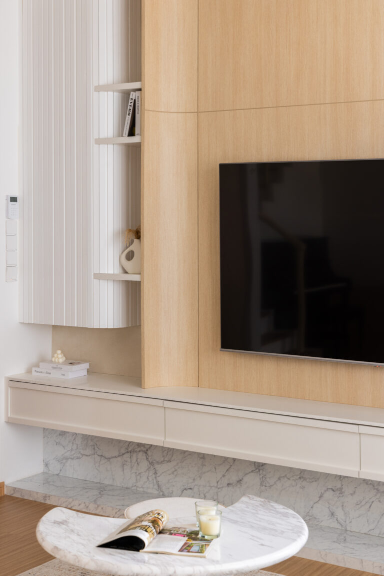 To achieve this balance, we designed the common areas around the core principles of modern Muji: clean lines, natural textures, thoughtful storage, and a soft, neutral palette. These spaces showcase the quiet elegance of Muji design while subtly reflecting the family’s lifestyle—flexible layouts for gatherings, durable materials for daily use, and intentional zones that promote connection as well as personal downtime.
